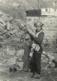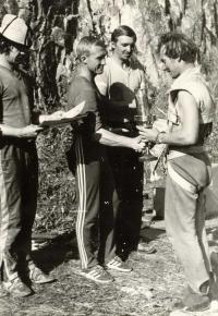 Игорь Шаповаленко работаетвторым на стене с первым лагерным капроновым рюкзаком. |