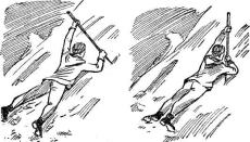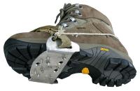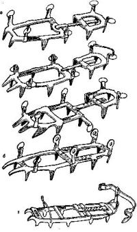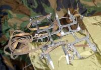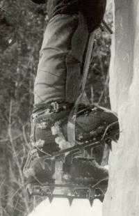 Дома мы тренировались в туристических «вибрамах». Стоило это детище в любом обувном магазине десять рублей пара. К ботинку мы привязывали брезентовой лентой кошки ВЦСПС. Ребята, это было что-то! Особенно застежка. Просто патент советского времени. Если в этом работаешь целый день, и ноги попадают в воду, а затем «бахает» мороз, то образуется ледяная корка вокруг застежки и по всему брезентовому ремню. Вечером эту застежку нужно еще и отстегнуть. Непередаваемые ощущения.