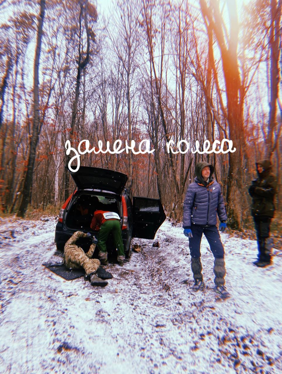 В 10:40 произошла вторая техническая заминка - прокололи колесо. Пока парни занимались его заменой, было решено организовать завтрак прямо там, на дороге лесорубов. Пикник на обочине, так сказать. Чай, бутерброды с колбасой и сыром, вегетарианский вариант бутербродов с сыром и сыром, шоколадки – подняли настроение. Сильнее захотелось поскорее выйти на маршрут. Колесо поменяли, выехали в 11:50.