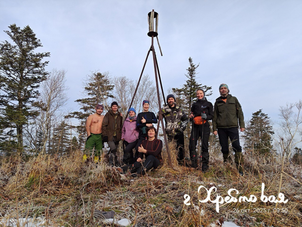 В 09:10 Ольга дала команду на выход на вершину, без ожидания ещё не собравшихся. Это были я, Ренат, Рузиля и наши распотрошённые рюкзаки, гермомешки и прочее. Через 20 минут мы вышли, точнее даже выбежали, вдогонку группе, которая поднималась по тропе, а мы ломанулись напрямик, по более короткому пути, через достаточно плотный бурелом, чтобы сократить разрыв во времени. Налегке, без рюкзаков, уже через 10 минут мы были наверху и присоединились к фотосессии! Не часто тригоном горы Хребтовой встречает гостей, поэтому мы уважили его достаточным вниманием и фотоснимками.