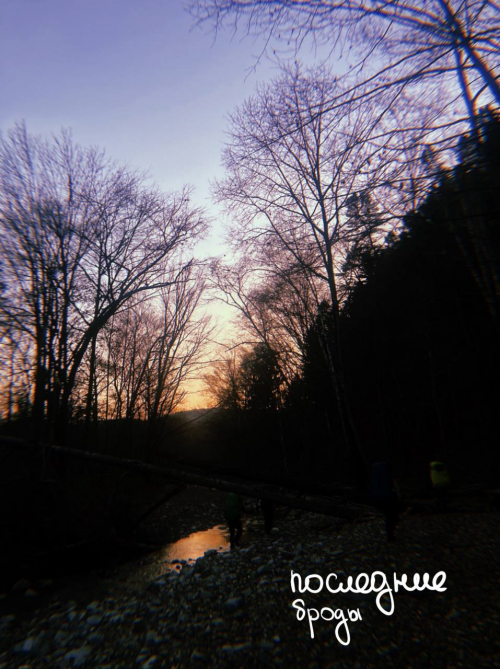 Вышли с обеда примерно в 16:30. Сделали ещё две ходки, уже не в строгом хронометраже, так как спешили к финишу. Этот завершающий участок трека был вдоль/поперёк/вдоль/поперёк речки (Стрелки?), бесконечные броды, потеря направления, возврат на верный путь, выход на заросшую лесовозную дорогу и вот, в 18:30, мы на финише! Водители быстренько переходят в новый режим, и уже через 10 минут оставляют нас и выезжают к месту старта. Мы, чтобы не замёрзнуть и не скучать, решаем идти в сторону трассы, под закатными лучами солнца, к ним на встречу. В 19:40 вышли к трассе. Приоделись в тёплое, достали все остатки еды, чай. Танцевали. Девочкам пришла в голову идея воспользоваться эффектом воздействия прикуренной сигареты на долгоожидаемый автобус. Короче, решили развести костёр, чтобы, по иронии судьбы, наши водители приехали сразу, после его зажигания. Необъяснимо, но факт. Как только были собраны веточки, уложены, в строго соответствующем порядке, и наши руки с зажигалками вознеслись над ними – показался свет фар от машины Маши. Через пару минут приехали Ренат и Леонид. На часах 20:40. Обнялись, упаковались и поехали. Были дома около полуночи.