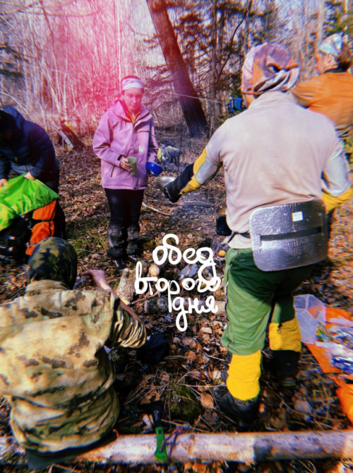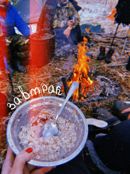 Проснулась в 6:20, так как дежурила, вместе с Леонидом, который к этому времени уже разжёг пионерский костёр, и Светланой. Топили снег, приготовили овсянку с черносливом и курагой, чай и кофе. Всё с элементами хвои и крошечных сушинок – неотъемлемый ингредиент блюд на основе снега. Окончательно все проснулись только в 07:30. К завтраку все собрались только к 07:50. Собрать лагерь к запланированным 08:00 уже не было шанса.