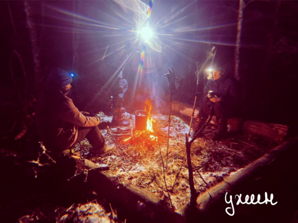 Переоделись и принялись за организацию бивака. Мне это видилось, как одна из картин Иеронима Босха. Кто знаком с творчеством этого художника, сразу поймёт, о чём я. И тут речь только о моём субъективном восприятии. Ребята действовали вполне уверенно и профессионально, но для меня все процессы настолько непривычны, что мозг воспринимал их карикатурно и по-Босховски. Три котла со снегом над костром, деревья, на чьих, страшных в ночи, длинных, костлявых ветках растут носки и рюкзаки. Торчащие из земли палки, с рукоятками в виде застывших перчаток. Люди, собирающие снег кружками, под звуки топора и пилы. И яркие, рандомно-перемещающиеся лучи фонарей. Картина супер!
