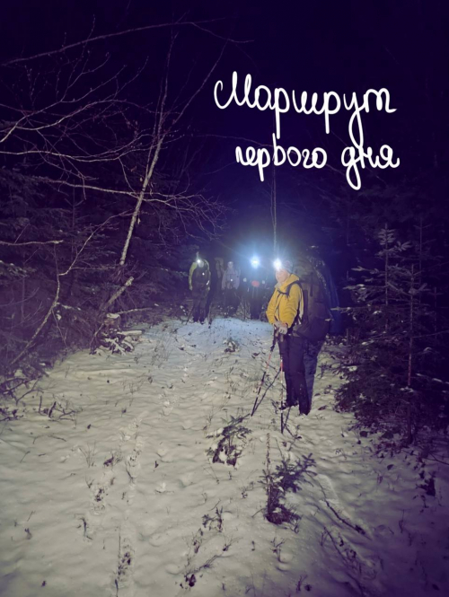 Прошли ещё две ходки, в том же темпе 50/10. Стемнело. Шли с ощутимым, но достаточно комфортным набором высоты. Мне казалось, что идём по тропе, возможно это был распадок. К сожалению, я, почти всегда, шла в конце и не слышала комментариев навигатора и руководителя относительно трека. Шли с фонарями, эффектно освещающими наш путь. Вокруг тишина, снег, ни намёка на ветерок. Взбадривали и не давали забыться, хлестающие по лицу, ветки.
