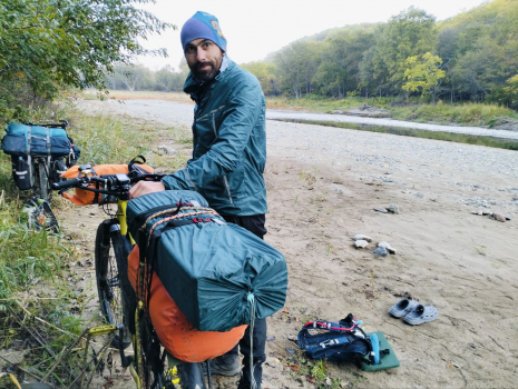 Утром Саша выглядел уже немного бодрее. Так что скорость передвижения увеличилась. Быстро доскакали по пыльной грунтовке до Чистоводного и свернули на долгожданную Кривую. Броды этой реки были немного глубже, но сама вода теплее, чем в Алексеевке. А какие виды! Зеркальная река, утесы, разноцветные сопки.. после очередного брода решили остановиться на ночёвку у живописного камня. Время, отведенное на поход плавно заканчивается. Решаем слить часть маршрута вдоль моря. Саня вечером разбирает барабан на заднем колесе. Половина собачек кончилась.